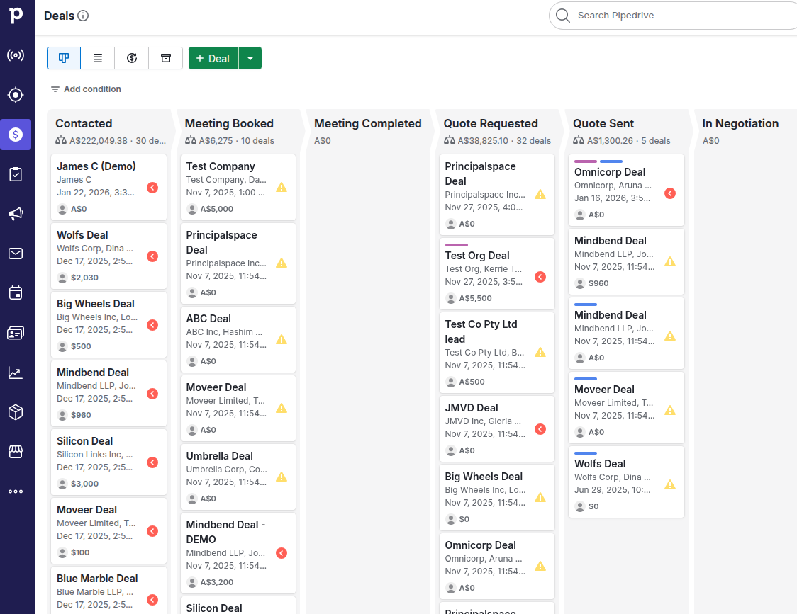 In a spreadsheet, your pipeline is a list. In a CRM, it can appears as a visual (usually Kanban style) board. You can see every deal at every stage - from first contact to closed-won - laid out in columns you can drag and drop.