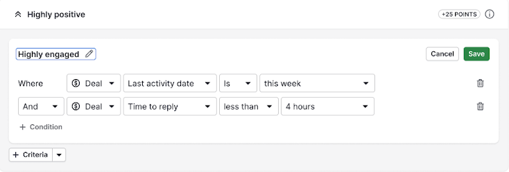You can set up to 10 criteria in total across different groups, and you don't need to establish criteria for all three groups. Once a match is found between a deal and your defined criteria, point values are assigned based on the group to which the criteria belong.